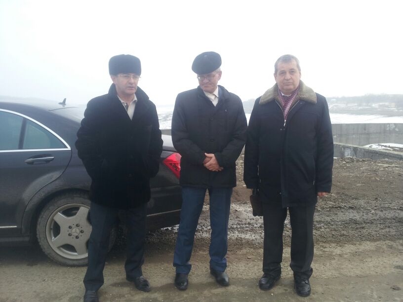 Фото 12 Главный инженер проекта Грозненского моря Мудаев Кудус, декан строительного факультета Грозненского государственного нефтяного технического университета Абуханов А.З. и директор Института безопасности гидротехнических сооружений Волосухин В.А. на фоне грунтовой напорной плотины водохранилища.